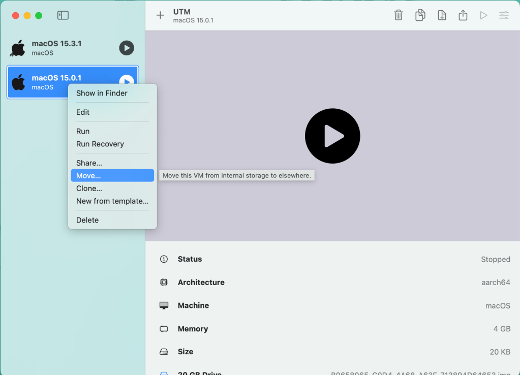 Disk kapasitesi endişeniz varsa bu sanal makine datasını harici bir diskte depolayabilirsiniz. Bunu yapmak için sanal makine listenizin bulunduğu UTM‘in ana ekranında sanal makinenin üzerine sağ tıklayarak (Control-Click yazsam yeni nesil anlamayacak) Move komutunu vermeniz gerekiyor.