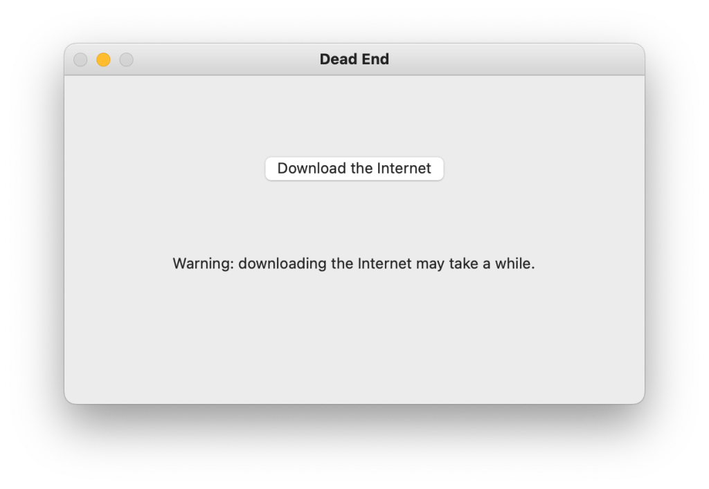 Dead End uygulamasını açtığınızda karşınıza üzerinde “İnternet’i İndir” yazan bir buton bulunan küçük bir uyarı penceresi gelir. Siz bütün interneti indirmek için butona tıkladığınız anda uygulama çöker ve hemen imleç dönen renkli plaj topuna dönüşür.