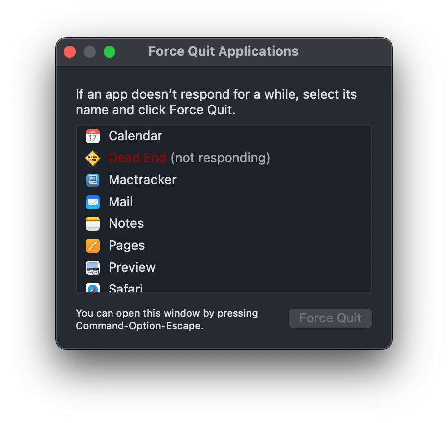 Plaj topunu gördükten sonra uygulamayı sonlandırmak için Force Quit komutunu (Command + Option + Esc) kullandığınızda Force Quit Applications penceresinde Dead End uygulamasının karşısında Not Responding (Yanıt vermiyor) yazdığını görebilirsiniz.