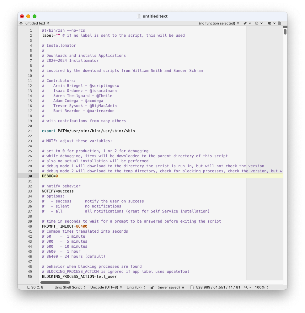 8. GitHub‘dan indirdiğiniz Installomator Script‘i başlangıç noktasında DEBUG modundadır. DEBUG modunu kapatmak ve prodüksiyon ortamında kullanmaya başlamak için 30. satırda bulunan DEBUG=1 yazısını DEBUG=0 ile değiştirmeniz gerekmektedir.