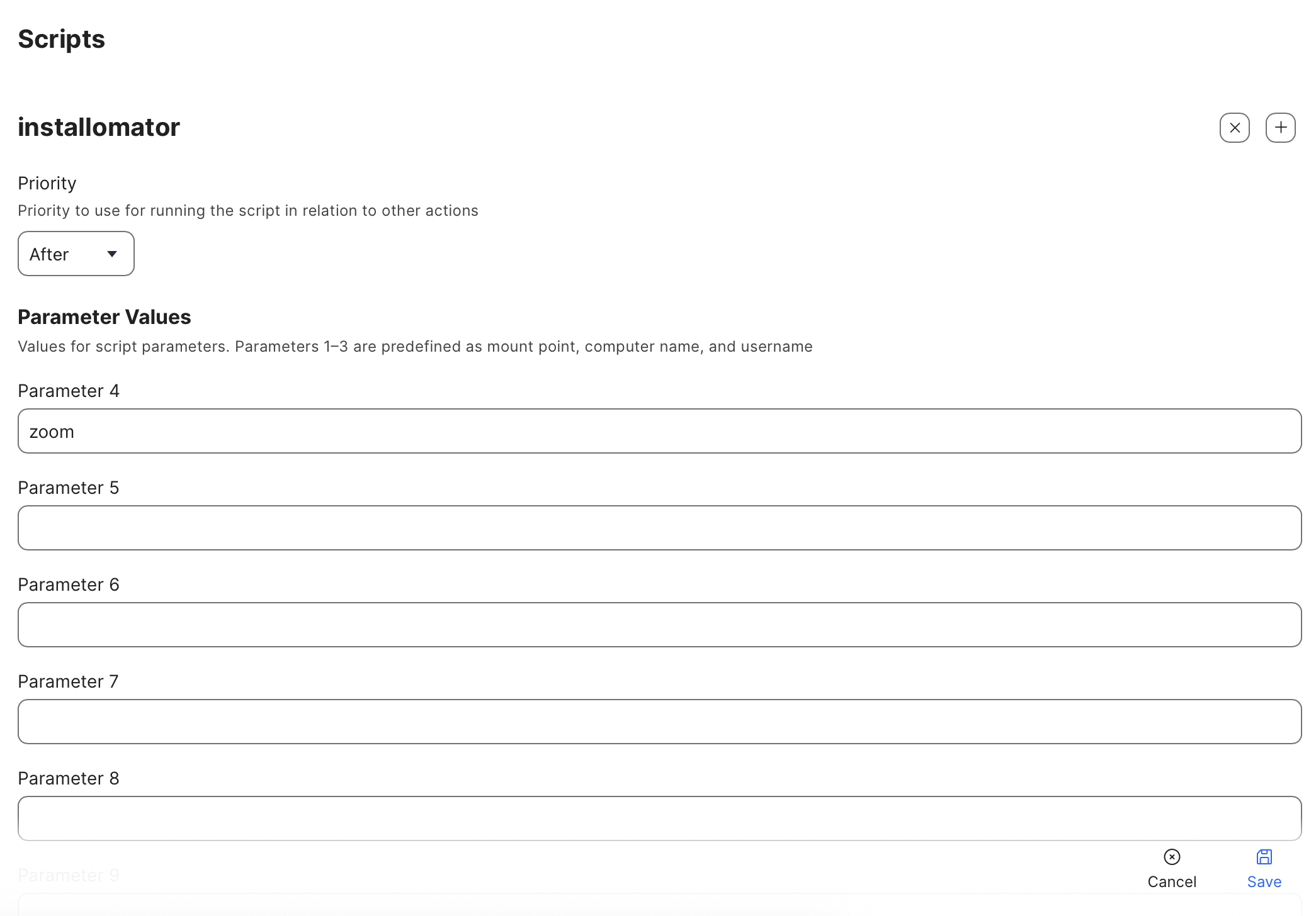 20. Scripts payload’unu ekledikten sonra karşınıza açılan ekranda Installomator için kullanılacak parametreleri görebilirsiniz. Parameter 4 kutucuğuna göndermek istediğiniz uygulamanın ismini yazmalısınız. Ancak bu alana uygulamanın ismini nasıl yazacağınız önemli. Uygulamanın ismini Zoom olarak yazmanız ile zoom olarak yazmanız arasında fark var. Hangi uygulamayı gönderecekseniz o uygulamanın nasıl yazılması gerektiğini https://github.com/Installomator/Installomator/blob/main/Labels.txt adresinden erişebileceğiniz Labels belgesinde bulmalı ve tam olarak orada göründüğü gibi yazmalısınız.