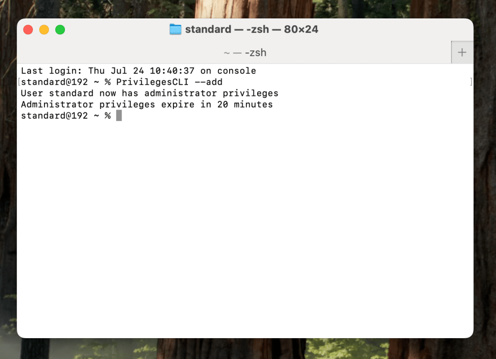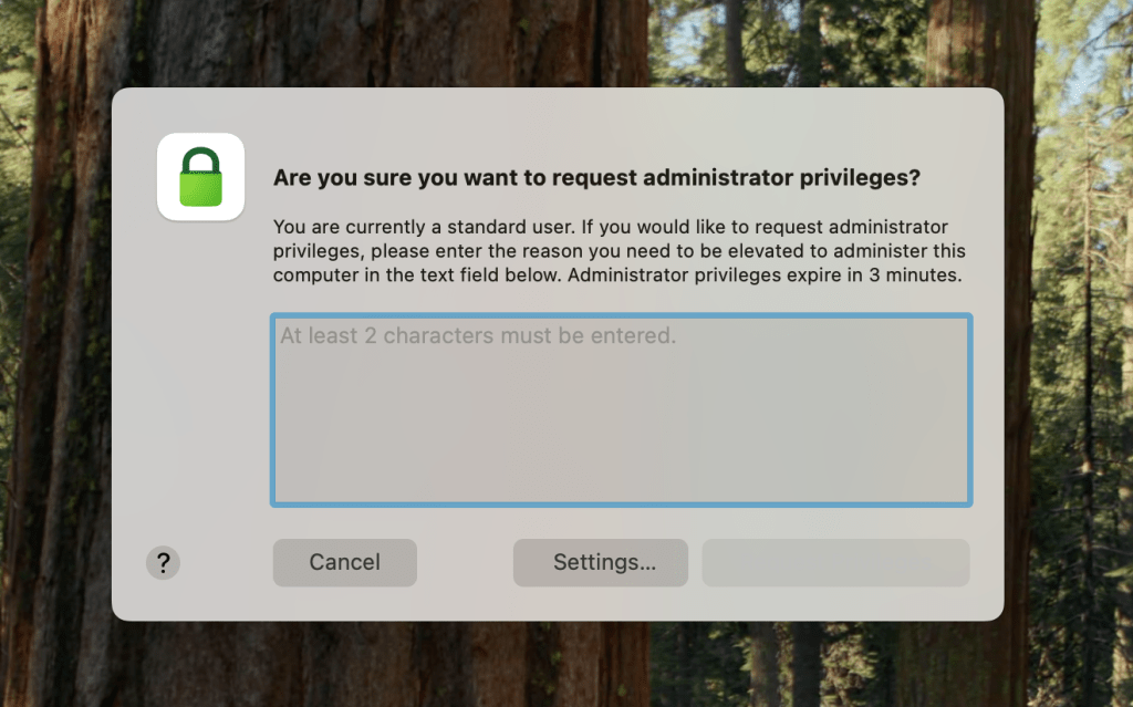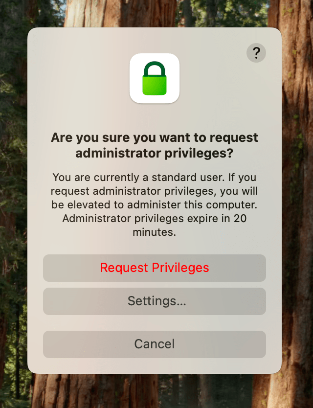 Privileges uygulamasını MDM üzerinden kullanıcılarınıza gönderdiğinizde, kullanıcılarınız eğer Standart yetkili kullanıcılar ise Privileges uygulamasını çalıştırarak kendi kendilerine geçici olarak Admin yetkisi alabilirler. Default ayar 20 dakikaya ayarlı durumdadır ve Dock üzerindeki simgesinden de aktif olup olmadığını ve kaç dk yetkiniz kaldığını öğrenebilirsiniz.