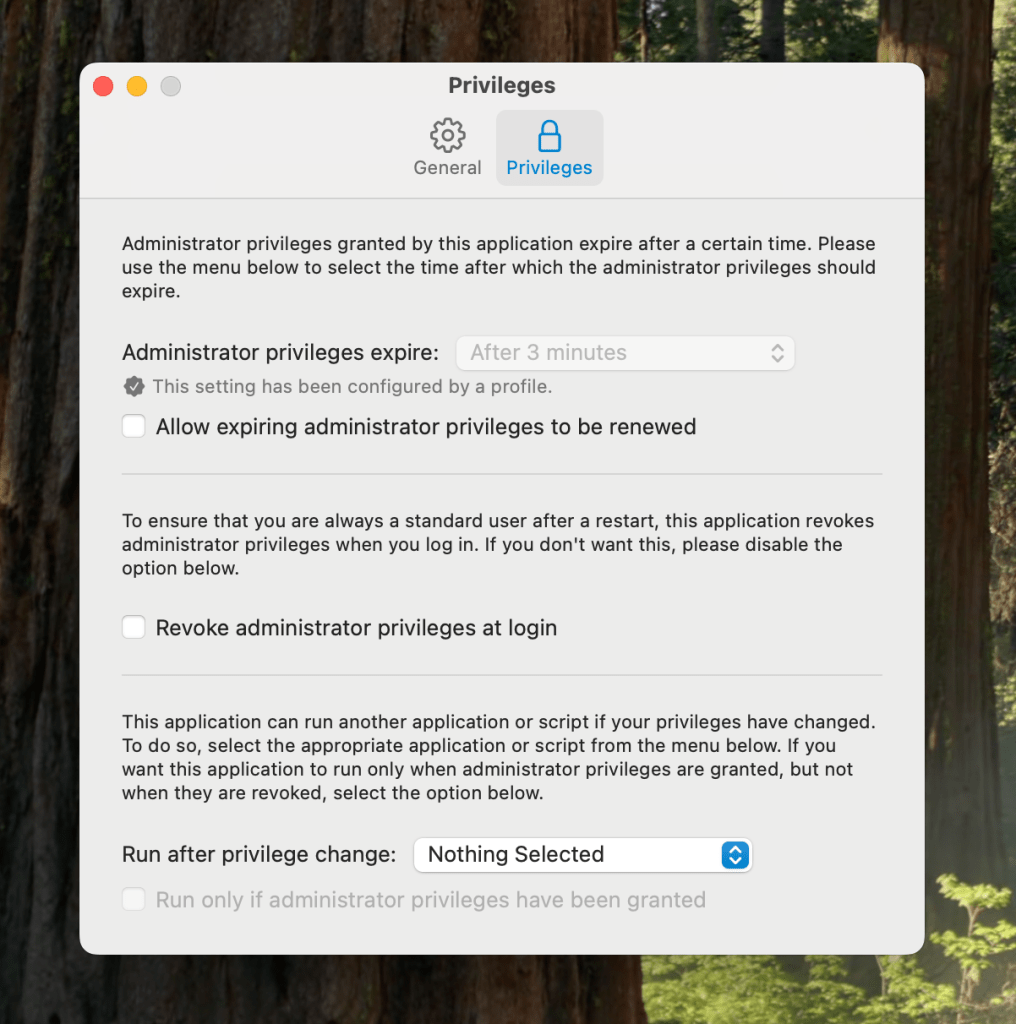 Ayarlar, bir MDM konfigürasyon profili üzerinden yüklendiğinde son kullanıcının elinden Privileges uygulamasının ayarlarında değişiklik yapma haklarını almış olursunuz. Böylece istedikleri gibi süre ekleyememiş olurlar.