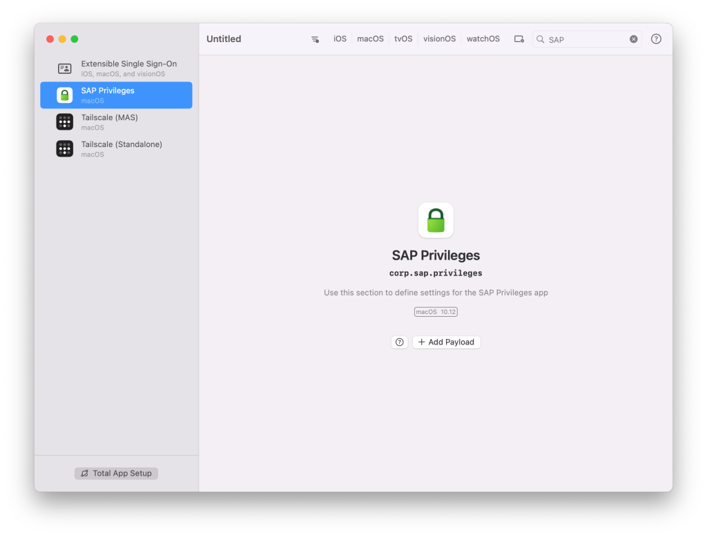Bu iki alanı doldurduktan sonra ekranın sağ üst kısmındaki arama kutucuğuna tıklayarak SAP yazarak SAP Privileges‘ı kontrol edebileceğiniz payload’a ulaşabilirsiniz. + Add Payload butonuna tıklayarak, SAP Privileges ayarlarını oluşturmakta olduğunuz profilinizin ayarlarına ekleyebilirsiniz.