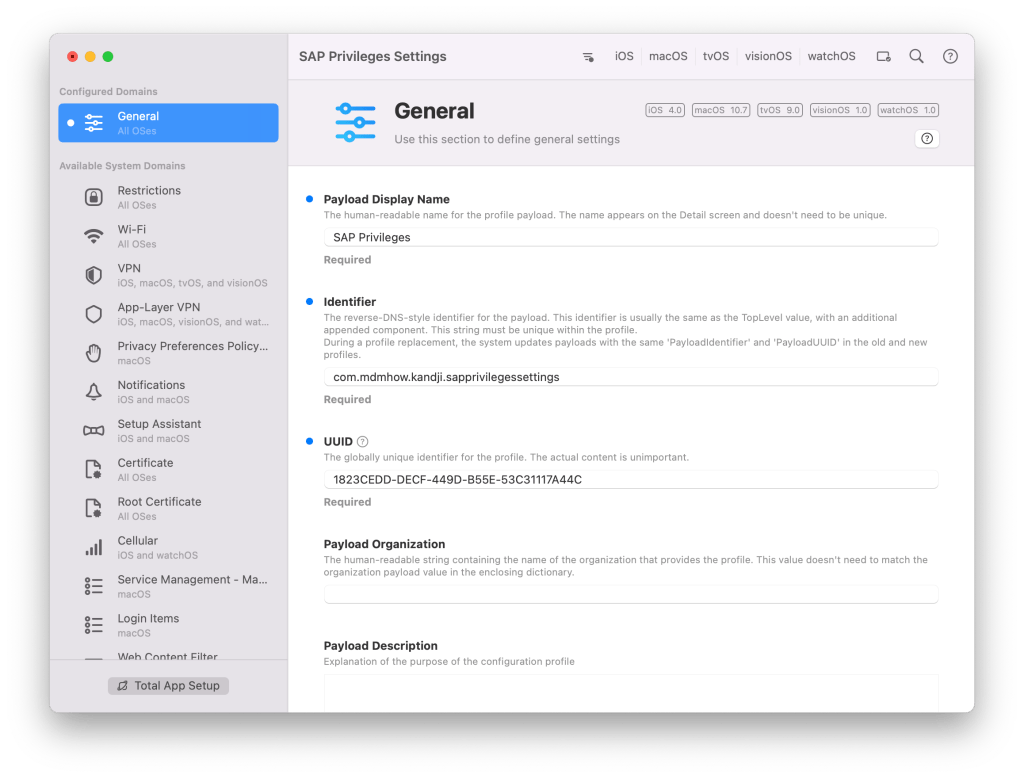 Identifer bölümünde gördüğünüz isim kendi bilgisayarınızın Local Hostname’i ile başlıyor ise burayı değiştirmenizi öneririm. iMazing Profile Editor ile ileride oluşturacağınız başka konfigürasyon profilleri ile oluşabilecek karışıklığı engellemiş olursunuz. Burada ters DNS yapısında bir isim verebilirsiniz. “com.mdmhow.kandji.sapprivilegessettings” gibi… Kurumunuzun adı, kullandığınız MDM çözümünün adı ve profilin kullanım amacını belirtmiş olursunuz.