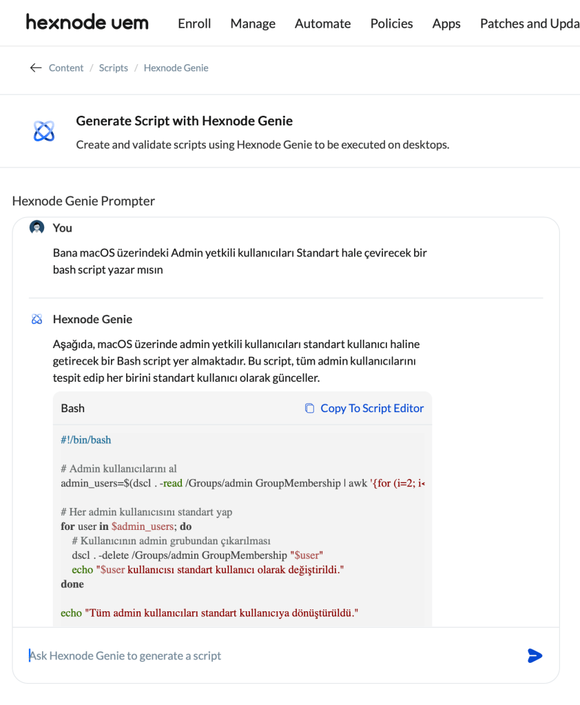 Son zamanlarda incelemeye başladığım Hexnode UEM içinde bulunan yapay zeka asistanı Genie‘yi denemek için birkaç kod yazdırdım. Hepsi başarıyla çalıştı. Sonra biraz haddimi aşarak İngilizce yazmayı bırakıp Türkçe yazmayı denedim ve hemen cevap verdi.