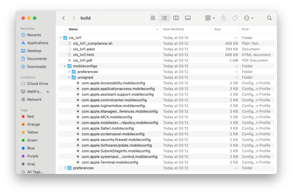 Komut işini tamamladıktan sonra mSCP/build klasörü içinde yer alan cis_lvl1 klasörünün içine baktığınızda ismi mobileconfigs olan yeni bir klasör oluşturulmuş olduğunu görürsünüz. Bu klasör içinde CIS Level 1 ile uyumlu tüm konfigürasyon profillerini .plist ve imzalanmamış .mobileconfig formatlarında bulabilirsiniz.