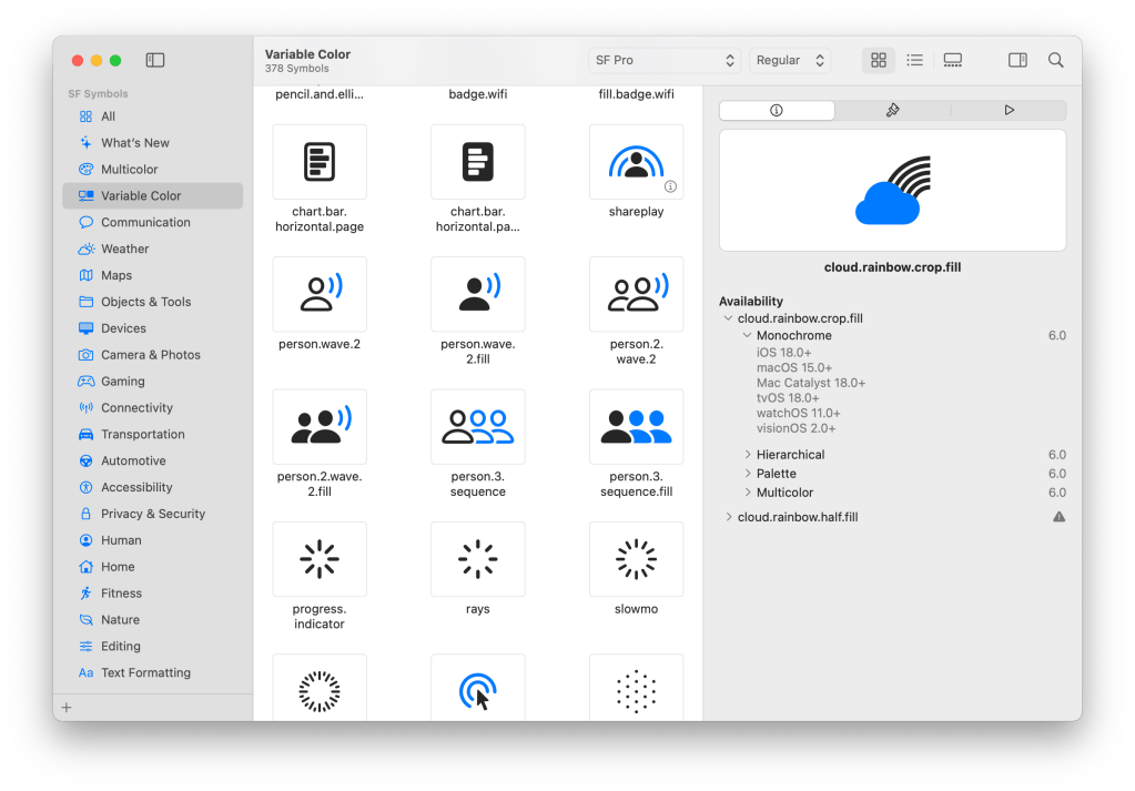 Yukarıda Support uygulamasının ekran fotoğrafında görünen her bir ikon Apple’ın SF Symbols uygulamasından alınmadır. Uygulamayı konfigüre ederken bu ikonların SF Symbols uygulamasındaki isimlerine ihtiyacınız olacak. SF Symbols uygulamasını bu adresten indirebilirsiniz. Aşağıda görünen simgenin tam ismini (cloud.rainbow.crop.fill) hemen simgenin altından görebilirsiniz.