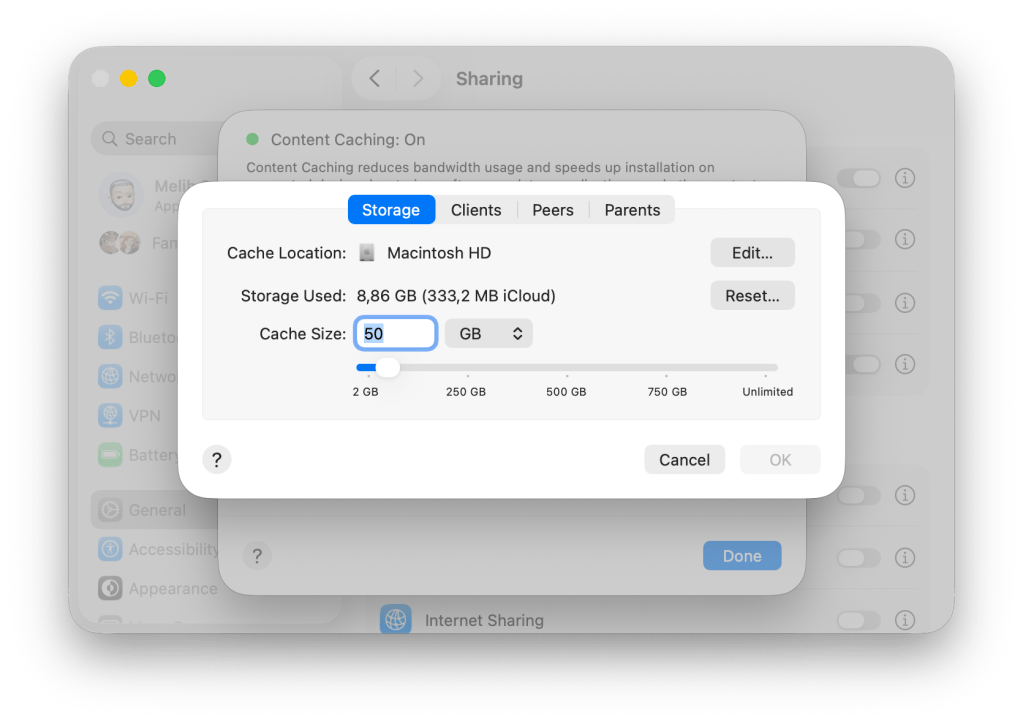 Storage başlığı altından Content Caching servisini aktif eden bilgisayarın diski üzerinde ne kadarlık bir disk kapasitesinin cache’leme işine ayrılacağını belirleyebilirsiniz. Eğer bilgisayarınıza bağlı bir başka disk bulunuyorsa veya diskiniz birden fazla partition barındırıyorsa cache datasının hangi diskte depolanacağını seçebilirsiniz. Cache Location seçeneği, sadece ikinci bir disk bağlı olduğu zaman görünebilir.