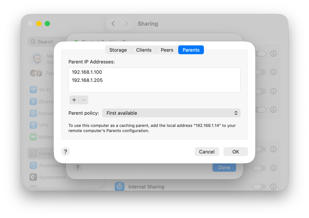 Parents başlığı altından birden fazla Content Caching sunucusu arasında data paylaşımının nasıl yapılabileceğine ilişkin tercihlerinizi belirtebilirsiniz. Ağınızda bulunan ve daha geniş bir cache datası içeren Parent sunucuların adreslerini Parent IP Addresses başlığı altına ekleyebilirsiniz. Böylece sizin kullandığınız Content Caching sunucusu kendisinde bulunmayan bir uygulama ile ilgili bir talep geldiğinde parent sunucuları kontrol edecektir.