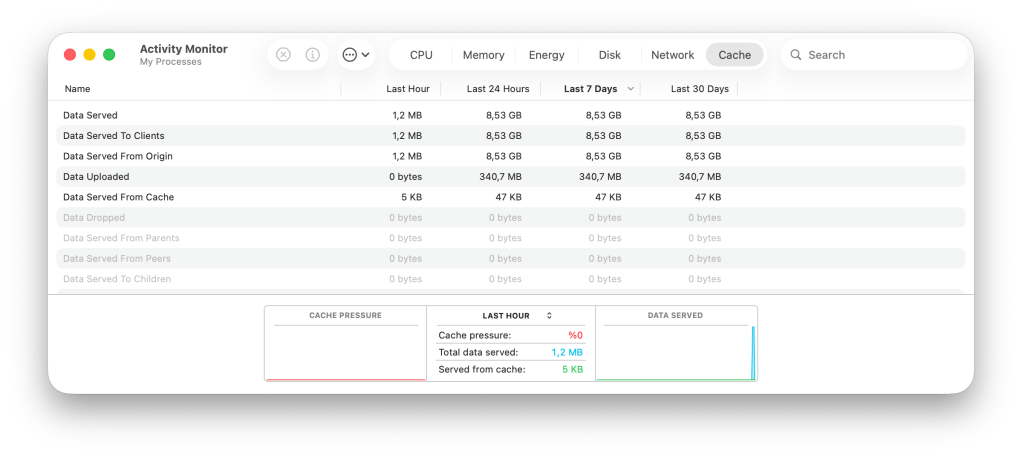 Göremezsiniz. Tek tek uygulama ismi veya güncelleme numarası olarak göremezsiniz. Görebileceğiniz tek şey ne kadar verinin cache’lendiği ve ne kadar verinin sunulduğu bilgisi olacaktır. Bu bilgiye de Macintosh HD / Applications / Utilities / Activity Monitor uygulaması üzerinden Cache başlığı altından ulaşabilirsiniz. Buradaki Cache başlığı ancak bir Mac’te Content Caching servisi aktif ise görünebilir.