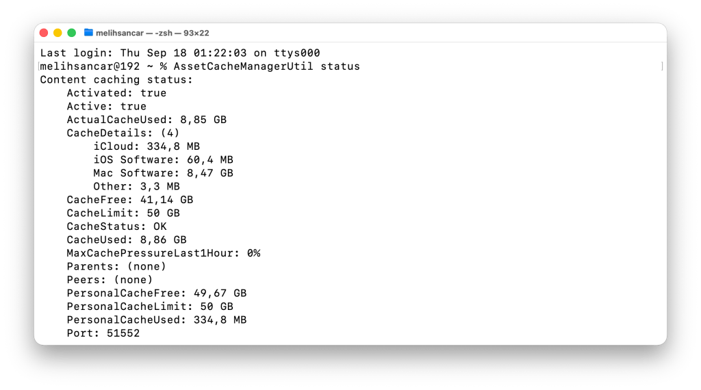 Activity Monitor‘e ek olarak Terminal üzerinden de assetcachemanagerutil komutu ile de cache datasına ilişkin istatistiki veriyi görebilirsiniz. Terminal uygulamasını açıp aşağıdaki satırı yazacak olursanız mevcut sunucu üzerindeki cache datası ile ilgili bilgileri alabilirsiniz.