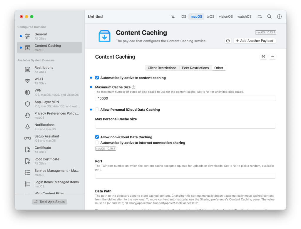 Kullandığınız MDM çözümünde buna benzer seçenekleri bulamadıysanız da iMazing Profile Editor gibi bir uygulama üzerinden Content Caching servisi için gerekli konfigürasyonu yaparak istediğiniz MDM ile dağıtabilirsiniz.