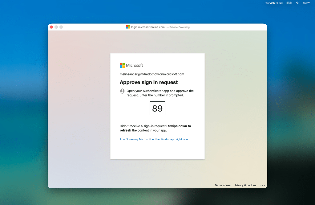 Yönettiğiniz cihazlar bu konfigürasyonu aldıklarında aktif olarak oturum açılmış olan kullanıcının karşısına Registration Required isminde bir bildirim gelir. Kullanıcı bu bildirime tıkladığında Single Sign-On for Mac isimli bir sayfa açılır. Önce lokal hesabının şifresini, sonra da Entra ID‘de tanımlı olan kullanıcı adı ve parolasını girdiğinde mevcut lokal kullanıcı, Entra ID‘deki kullanıcı bilgileri ile eşlenmiş olur. Kullanıcı Entra ID şifresini girdikten sonra MFA için Microsoft Authenticator ile de doğrulama yapılması gerekecektir.