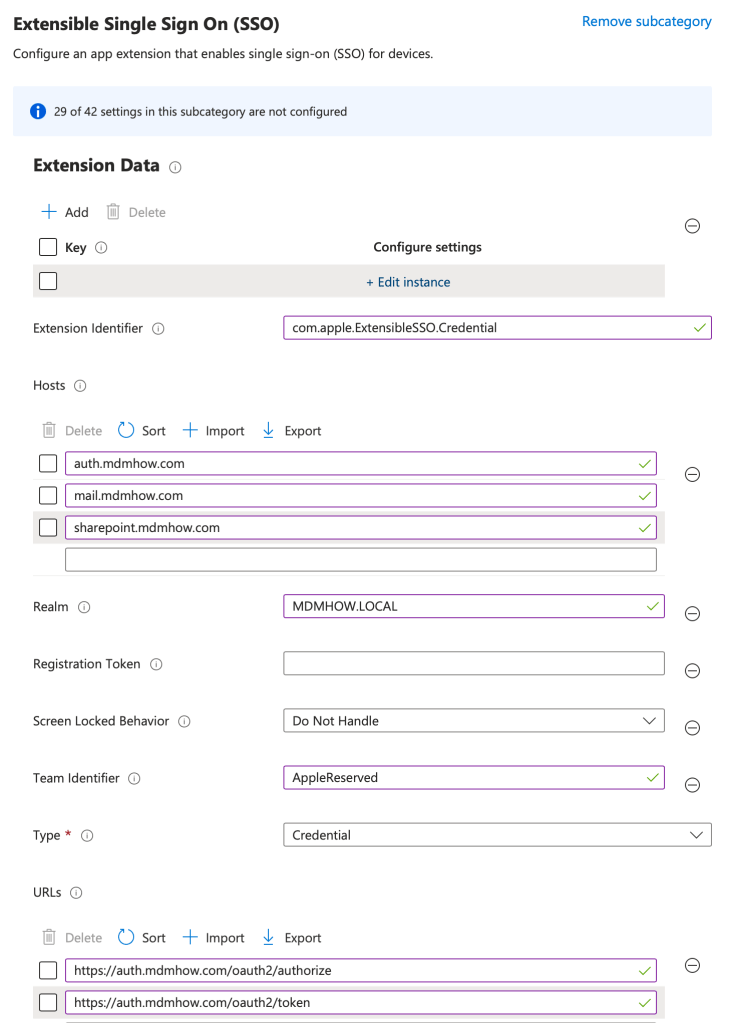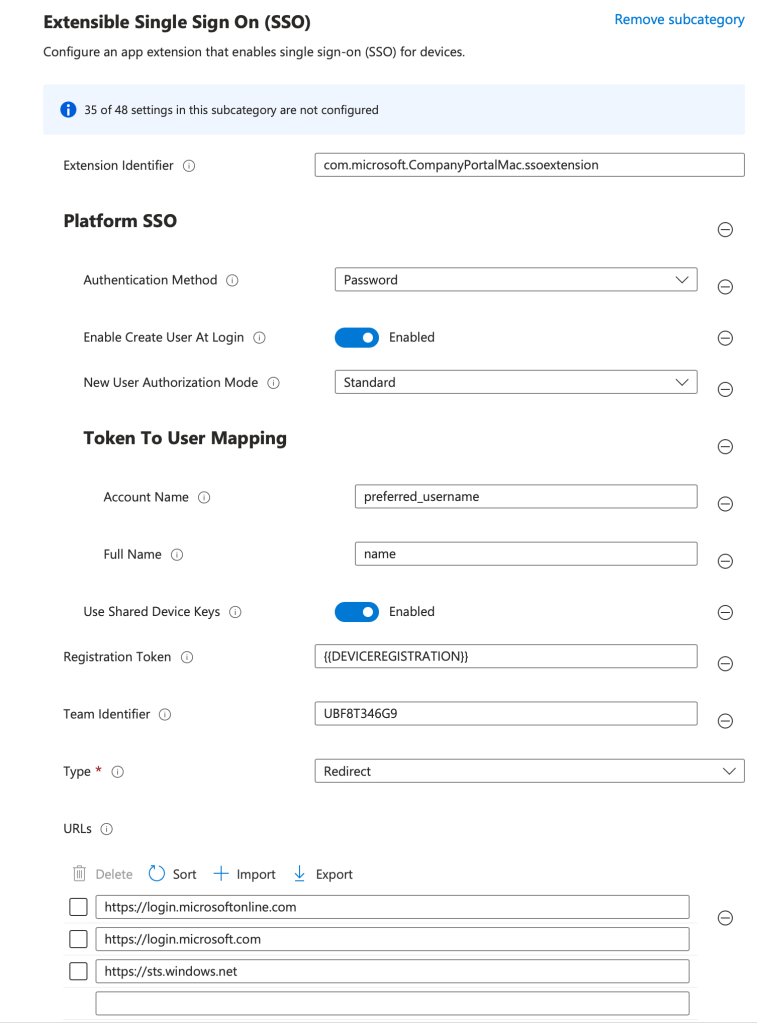 Platform SSO konfigürasyonu genellikle birçok MDM’de Extensible SSO konfigürasyonu içinde yer alır. Bu bağlamda Microsoft Intune üzerinden de Platform SSO konfigürasyonu yapmak istediğinizde Settings Catalog üzerinden Authentication başlığı altından Extensible Single Sign On başlığını kullanabilirsiniz. Platform SSO, Extensible Single Sign On içinde ayrı bir kategori olarak bulunur. Platform SSO için aşağıdaki ekran görüntüsünde göründüğü gibi bir konfigürasyon yapıp kullanıcılara gönderebilirsiniz. Bu konfigürasyon ayarlarının birçoğu Microsoft’un bu makalesinden geliyor.