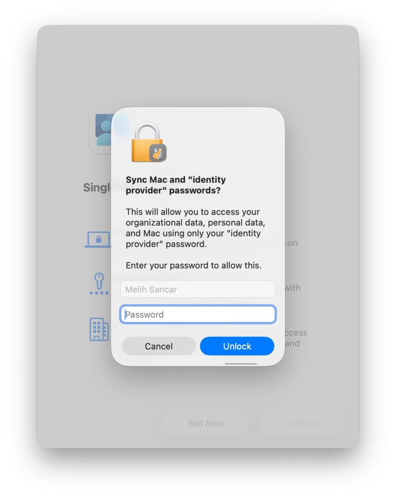 Bu seçenek, kullanıcılarınızın bilgisayarlarında bulunan lokal hesapların şifrelerini Entra ID’de tanımlı olan şifreleri ile eşlemek için kullanılır. Kurumunuzun parola politikaları doğrultusunda yapılan değişiklikler doğrudan kullanıcı parolalarını etkiler. Kullanıcı hesap ismi olduğu gibi bırakılır ve sadece parola senkronize edilir. Kullanıcı Touch ID gibi biyometrik tanımlama özelliklerini kullanabilir. Ama elbette her restart sonrasında yeniden Entra ID parolasının girilmesi gerekir. Ki bildiğiniz gibi bu durum aslında lokal hesaplar için de geçerli.