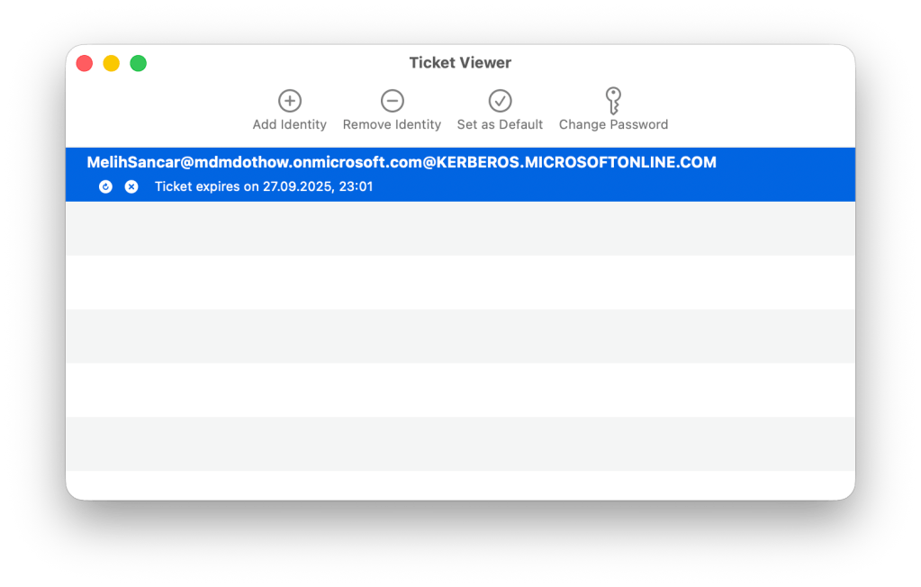 Registration işlemi tamamlandıktan sonra macOS’un Ticket Viewer uygulamasını açacak olursanız aktif olan Kerberos ticket‘ını görebilirsiniz. Ticket Viewer uygulamasına hızlıca bir Spotlight araması ile de ulaşabilirsiniz. Ama sistem içindeki adresi şöyle: Macintosh HD/System/Library/CoreServices/Applications/Ticket Viewer.app