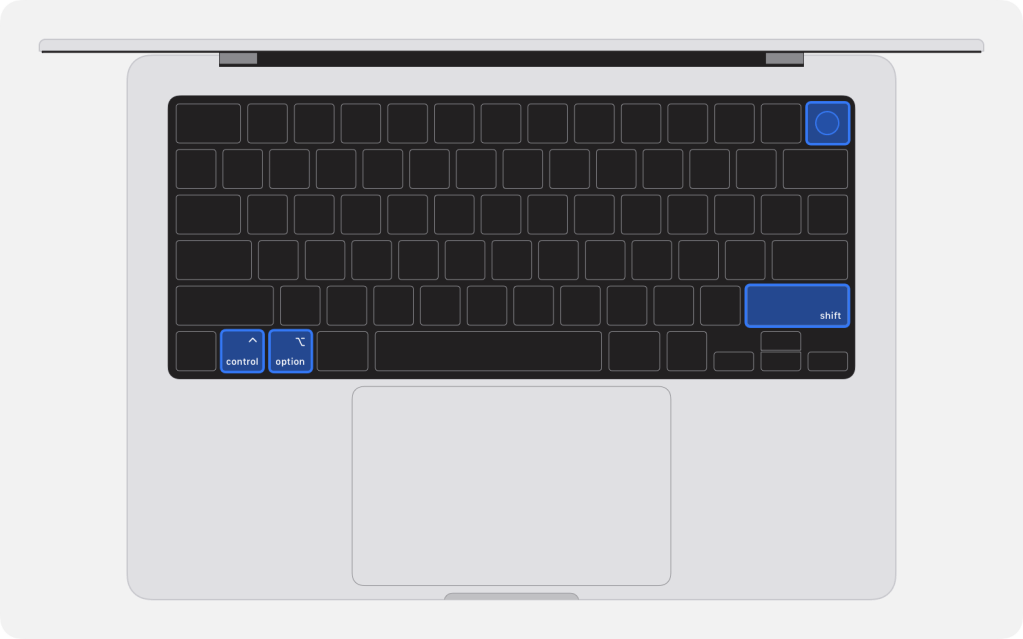 Sol taraftaki Control, sol taraftaki Option, sağ taraftaki Shift ve Power tuşlarına aynı anda basın ve 10 saniye boyunca basılı tutun. Sonra parmaklarınızı Control, Option ve Shift‘ten çekerek Power tuşuna bir 10 saniye daha basın.