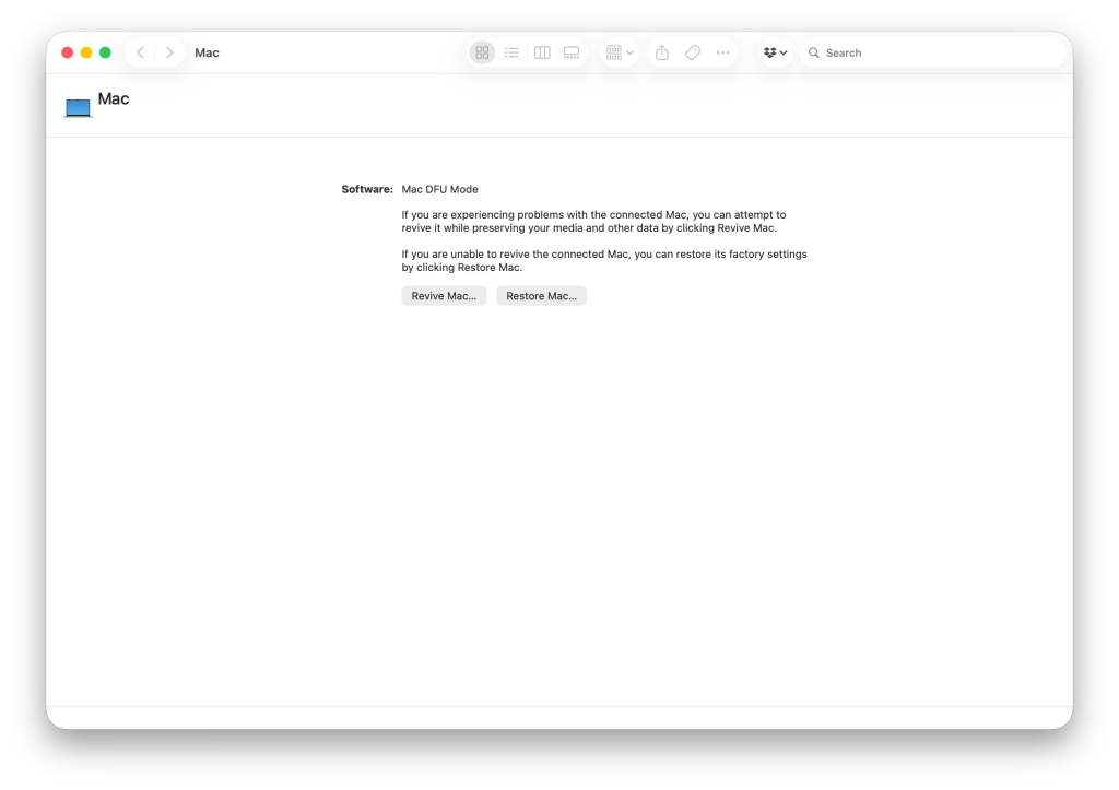 6. Configurator kullanıyorsanız ekranda çıkan DFU yazısının üzerine sağ tıkladığınızda açılan menüden Restore seçeneğini seçerek; Finder‘ı kullanıyorsanız da Restore Mac butonuna tıklayarak sorun yaşadığınız Mac’i sıfırlayarak yeniden macOS kurabilirsiniz.