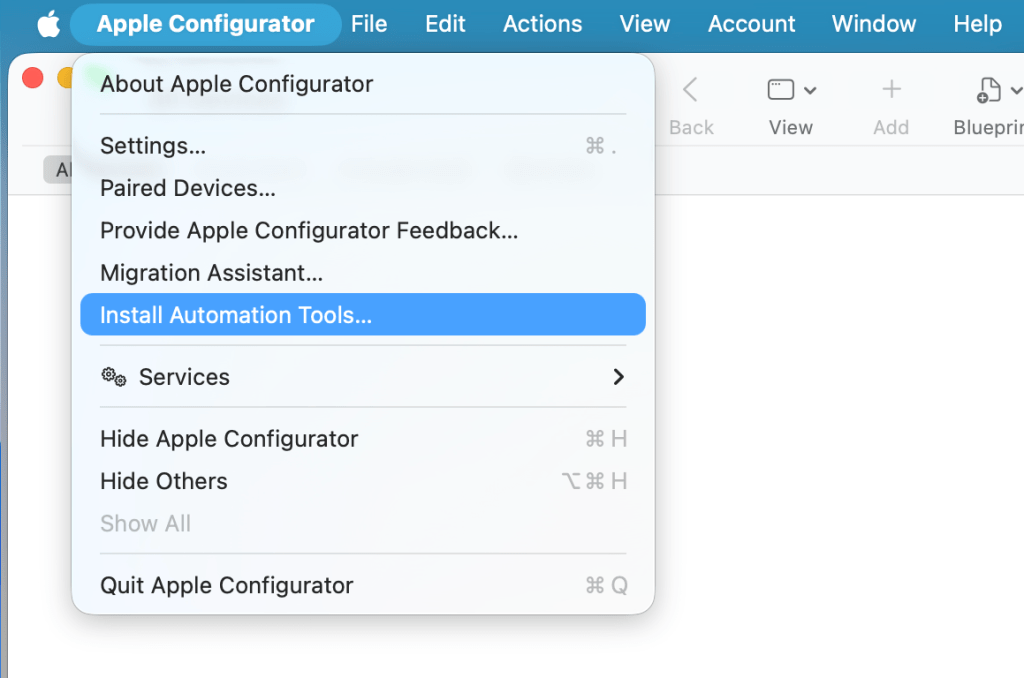 6. Bu adımdan sonra Apple Configurator‘u açarak Apple Configurator menüsünden Install Automation Tools seçeneğini kullanmanız ve cfgutil isimli komut satırı aracını aktifleştirmeniz gerekiyor.