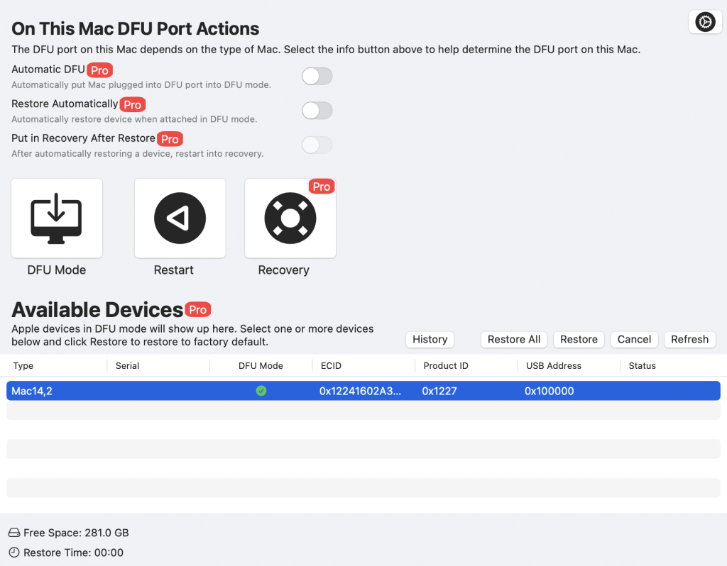 Yukarıda size sorun yaşadığınız bir cihazı yeniden kurmak için iki ayrı yöntem anlattım. Üçüncü bir yöntem daha var. Two Canoes yazılım firmasının geliştirdiği DFU Blaster Pro isimli uygulama, macvdmtool ile aynı işi yapıyor. Yukarıdaki kadar komut girmeden, kullanıma hazır bir şekilde tek tuşla DFU moduna alabiliyorsunuz. Hatta bir tuşa basmanıza da gerek olmadan kablo ile birbirlerine bağlı Mac’i otomatik olarak DFU moduna alarak, yine otomatik olarak Restore işlemini başlatabiliyor.