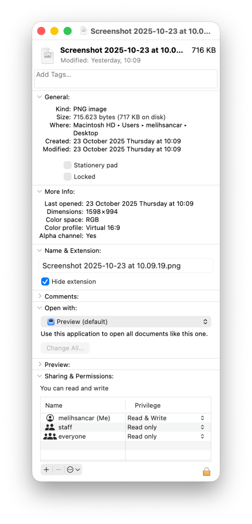 Mac’lerde herhangi bir dosyanın, klasörün ya da uygulamanın detay bilgilerine ulaşmak istediğimizde ⌘ + i tuş kombinasyonunu kullanırız. Ya da kısayol kullanmak yerine ilgili belgenin üzerine sağ tıklayarak Get Info (Türkçe sistemde Bilgi Ver) komutunu verebilirsiniz. Bunun sonucunda bir pencere açılır ve bilgi almak istediğiniz öğe ile ilgili detayları görebilirsiniz. Sadece detay görmekle kalmazsınız, bazı temel işlemleri de yapabilirsiniz. Örneğin Sharing & Permissions başlığı altından o dosya ile ilgili paylaşım ayarlarını düzenleyebilirsiniz. Veya Open With başlığı altından o belgenin hangi uygulama ile açılabileceğini belirleyebilirsiniz.