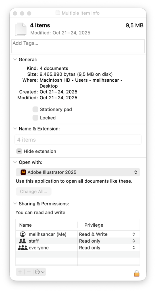 Açılan pencerede en üst kısma bakacak olursanız 4 öğenin seçili olduğunu ve onların toplam büyüklüğünü görebilirsiniz. Inspector penceresi açık durumda iken örneğin masaüstüne tıklayacak olursanız önceden seçtiğiniz 4 belgenin bilgisi yerine masaüstünün bilgisini görebilirsiniz. Hangi öğeyi veya öğeleri seçecek olursanız Inspector penceresi dinamik bir şekilde onların bilgisini size verecektir.