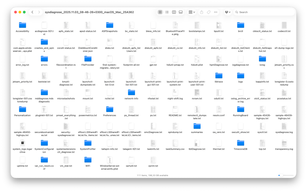 Sysdiagnose‘dan bahsederken ‘rapor’ diyorum ama aklınıza bir tane TXT veya PDF belgesi gelmesin. Örnek bir sysdiagnose raporu şuna benzer.