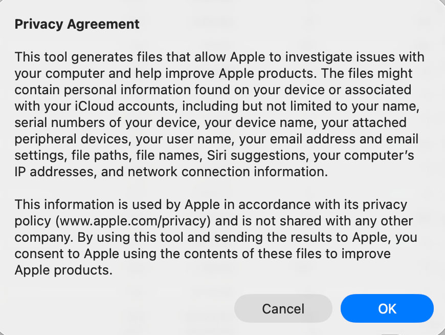 Sysdiagnose raporunu oluşturmadan önce sisteminiz sizi gizlilik konusunda uyaracaktır. Çünkü aslında cihazınızın donanım bileşenleni, çevre birimleri, işletim sisteminiz, uygulamalarınız, mail adresiniz ve kullanım alışkanlıklarınıza ilişkin birtakım verileri toplar. Bu bilgiler örneğin web tarayıcı tarihçeniz gibi kişisel bilgileri içermez. Ama yine de kiminle ve nasıl bir şekilde paylaştığınız konusunda dikkatli olmalısınız.