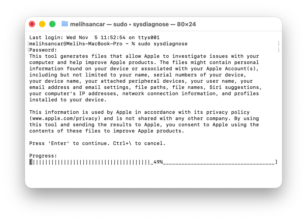 sudo ile başladığı için otomatik olarak bir sonraki satırda Admin parolasını isteyecektir. Hemen arkasından gelen gizlilik ile ilgili bir bilgilendirme mesajı sonrasında raporu oluşturmaya başlar. Oluşturulan rapor yine Macintosh HD/private/var/tmp klasörü altına kaydedilecektir.