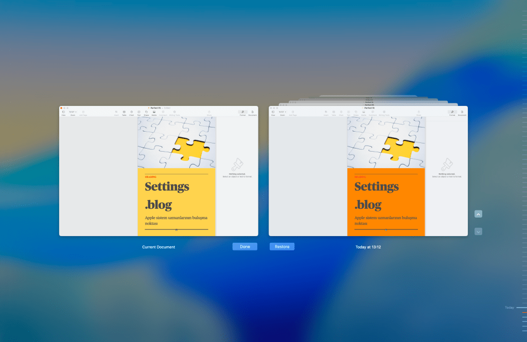 Mac’imizde oluşturduğumuz dokümanların Time Machine yedekleri benzeri bir versiyon tarihçesi otomatik olarak tutulur. Bunu aktif hale getirmeniz için özel bir şey yapmanıza gerek yok. Standart olarak çoğu Apple uygulaması için aktif durumdadır zaten.