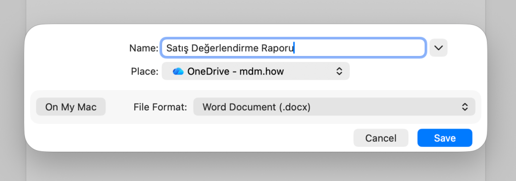 Belgenizi ilk defa kaydederken masaüstü yerine OneDrive seçeneğini seçecek olursanız her iki fonksiyonun da açıldığını görebilirsiniz. Ki zaten Word de sizi önce OneDrive’a kaydetmeye yönlendirecektir.