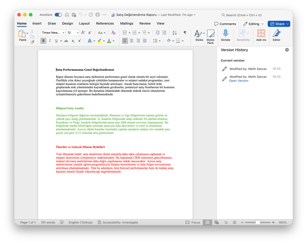 Belge OneDrive‘a kaydedildikten sonra Autosave seçeneğinin ve Browse Version History menüsünün aktif hale geldiğini görebilirsiniz. File > Browse Version History komutunu verdikten sonra karşınıza aşağıdaki gibi bir ekran gelecektir. Sağ taraftaki Version History bölümünden belgenin geçmiş versiyonlarının bir listesini görebilirsiniz. Biliyorum, Apple’ınki kadar havalı değil. Ama yine de çalışıyor.