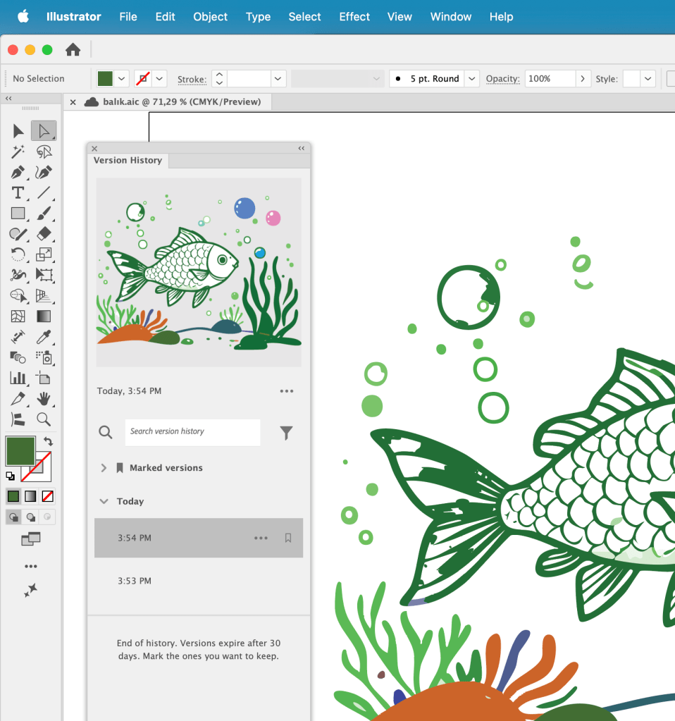 Örnek olarak Illustrator ile hazırlanmış bir çalışma Save penceresinde Save Cloud Document seçeneği ile kaydedilirse, yapılan her değişiklik otomatik olarak birer versiyon olarak kaydedilecektir. Bu versiyonlar Adobe Creative Cloud depolama alanınızda 30 güne kadar saklanırlar. Belgenin eski versiyonlarına File > Version History seçeneği ile ulaşabilirsiniz. Bu pencere üzerinde tarih ve saat bilgileri ile kayıtlı tüm versiyonlar listelenir.