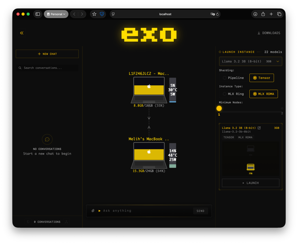 Mac’lerin bir cluster yapısında çalışmasını sağlayabilmek için bir çözüme ihtiyacınız olacak. Bunu Exo isimli açık kaynak bir proje gayet güzel bir şekilde yapıyor. Exo’yu bu adresten inceleyebilir ve indirebilirsiniz. Exo‘yu cluster yapısı içinde kullanacağınız tüm Mac’lere yüklemeniz ve uygulama içinden kullanacağınız LLM‘i seçip indirmeniz gerekiyor. Bazı modeller biraz fazlaca büyük. Örneğin DeepSeek‘i indirmek isterseniz bilgisayarınızda 700GB boş yer bulunuyor olması gerekiyor. Eğer böyle bir boş alan yoksa Exo içinden o modelleri de indirilebilir olarak göremiyorsunuz.