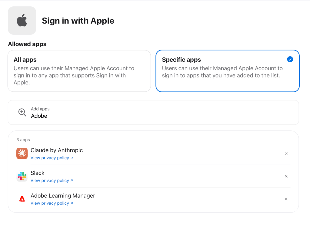Şirket çalışanlarının kurumsal Apple kimlikleri ile herhangi bir uygulamaya giriş yapmalarını tercih etmiyorsanız Sign in With Apple bölümünden buna kısıt getirebilirsiniz. İsterseniz tüm uygulamalara izin verebilirsiniz. İsterseniz de bunu sadece sizin belirlediğiniz uygulamalar ile sınırlandırabilirsiniz.