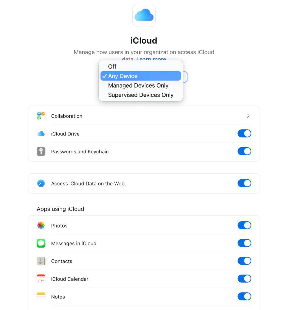 Apple Services bölümüne girdiğinizde listenin en üstünde iCloud servislerine erişim seçenekleri bulunur. Kullanıcıların Managed Apple Account’ları ile hangi iCloud servisine erişebileceklerini tek tek seçebilirsiniz. Öncelikle, iCloud servislerinin hangi tür cihazlarda kullanılabileceğini seçebilirsiniz. Listenin en üstünde yer alan menüden Off seçeneğini seçerseniz iCloud servislerinin tamamını kapatmış olursunuz. Any Device da herhangi bir cihazdan seçili iCloud servislerine erişim iznini vermiş olursunuz. Eğer sadece kurumsal olarak dağıtılan cihazlardan yönetilen Apple kimliklerine erişim yapılmasını istiyorsanız Managed Devices Only veya Supervised Devices Only seçeneklerinden birini kullanabilirsiniz.