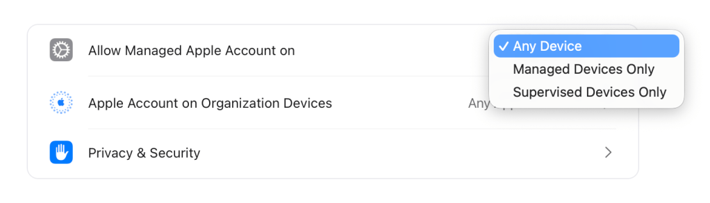 Allow Managed Apple Account On: Yönetilen Apple hesapları ile hangi tür cihazlara giriş yapılabileceğini bu bölümden seçebilirsiniz. Any Device seçeneği, herhangi bir kısıtlama yapmamak anlamına gelir. Managed Devices Only seçeneği, bir MDM sunucuya herhangi bir yöntem ile kayıt olmuş cihazlar ile sınırlandırmak demektir. Supervised Devices Only seçeneği ise cihazların denetimli modda olmasını şart koşar.