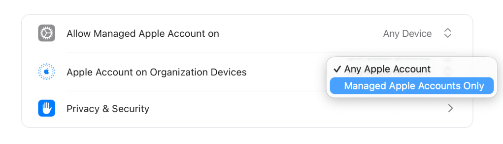 Apple Account on Organization Devices: Bir üstteki seçenek ile benzer bir işlevi yerine getirir. Bu seçenek, kurumsal olarak yönetilen cihazlarda ne tür Apple hesapları kullanabileceğinizi belirlemek için kullanılır. Any Apple Account seçeneği, kullanıcılarınıza kurumsal cihazlarına kişisel Apple Account’ları ile giriş yapabilme iznini verir. Eğer kişisel hesapların kullanılmasını engellemek istiyorsanız ayarı Managed Apple Accounts Only seçeneğinde tutmalısınız.